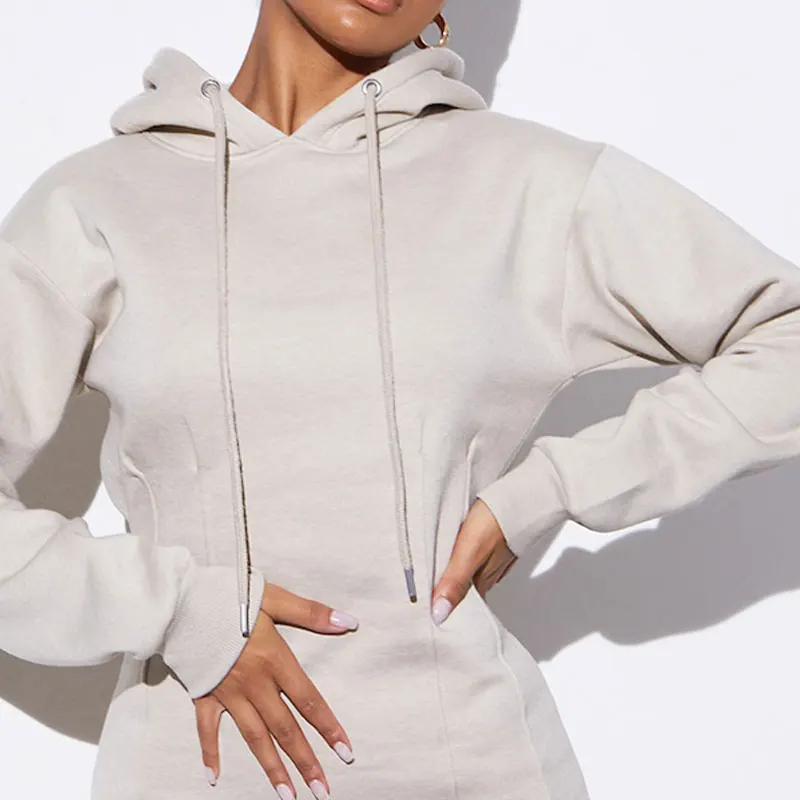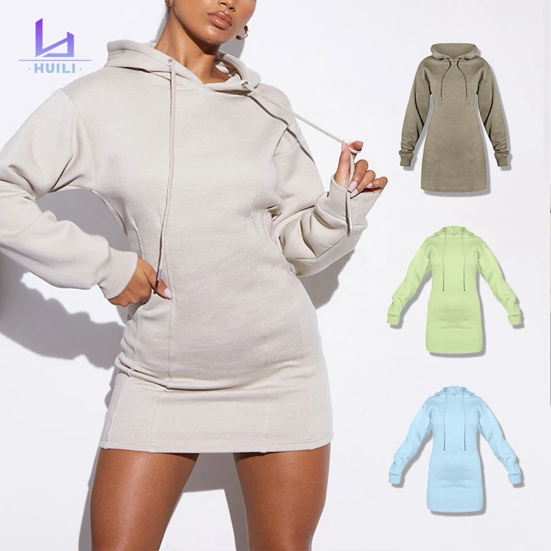 Huili Manufacturer Designer 100% Cotton French Terry Solid Color Blank Long Hoodie logo Custom Hoodie Dress for Women